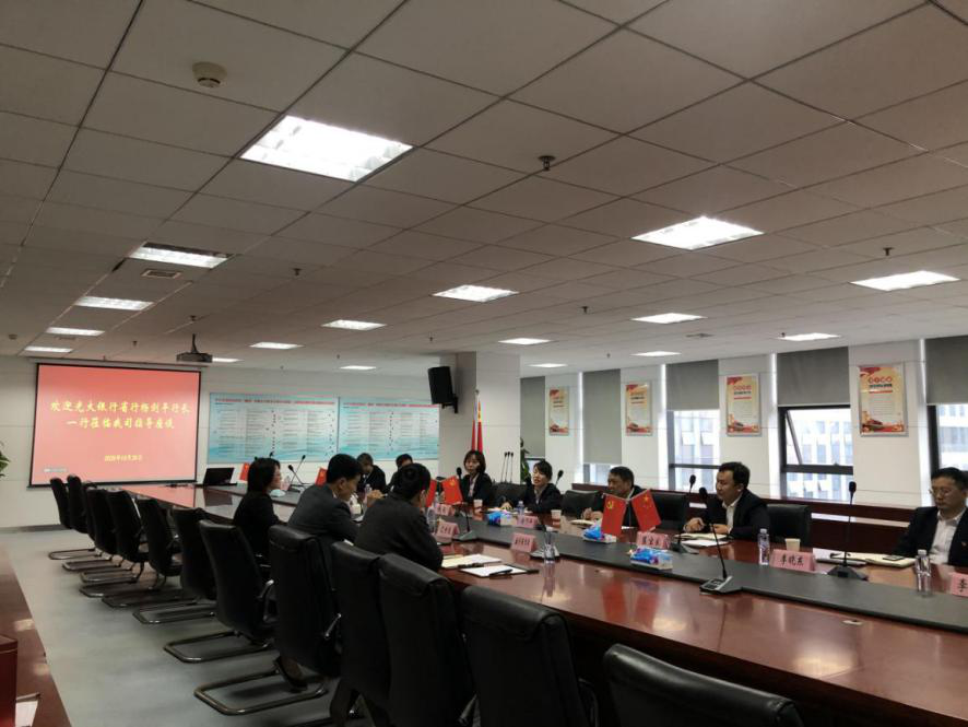 2020年10月26日,中国光大银行省行行长杨剑平一行来我司洽谈交流,公司党委书记、董事长沈世跃、党委委员、副总经理张黎丽及相关部门负责人参加洽谈。