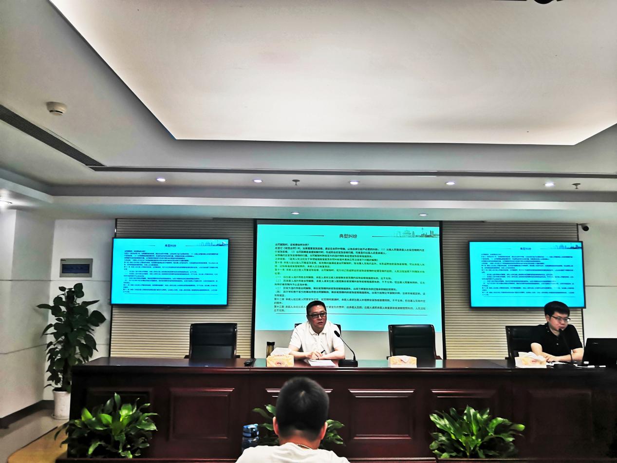 为加强公司公租房项目运营管理,改善公司公租房管理运营方式,提高物业服务水平,防范化解公租房管理服务中的安全风险、稳定风险、舆情风险,6月18日上午公司邀请代理我司公租房诉讼案件的安徽文理律师事务所杨园律师开展《公租房管理规范化》培训。物业公司、资产部、资金部、审监部负责资产运营、费用清收、财务审核、法务诉讼等方面工作的人员以及各公租房小区物业现场经理、楼管、客服人员参加培训。