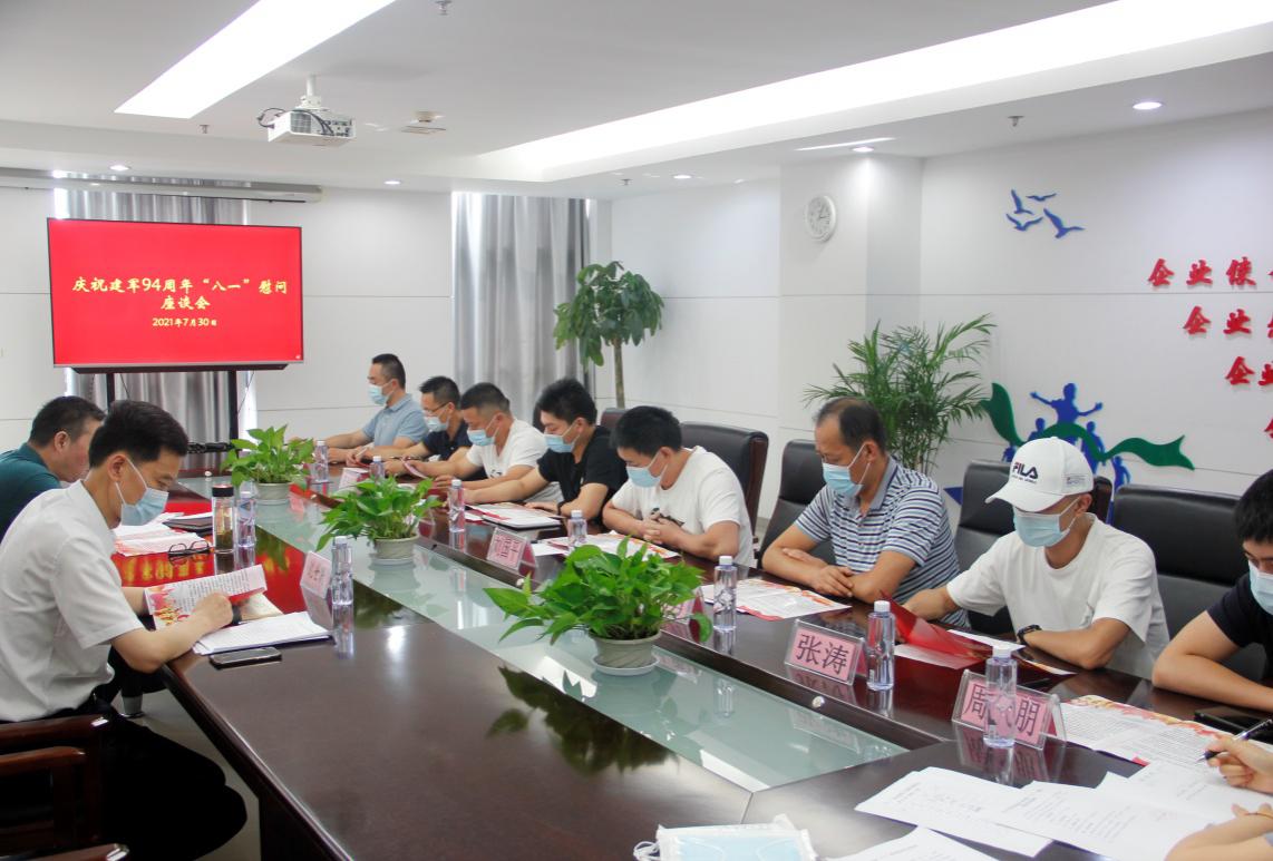 为进一步弘扬爱国拥军的优良传统,在中国人民解放军建军94周年之际,7月30日下午,公司党委召开庆祝建军94周年“八一”慰问座谈会,公司党委书记、董事长沈世跃、专职纪检负责人黄翔同志和8名退役军人代表参加会议。