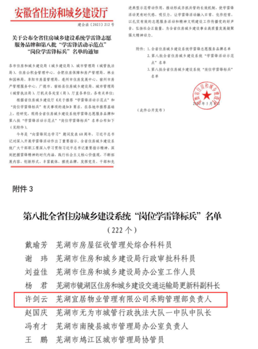 近日,安徽省住房和城乡建设厅印发《关于公布全省住房城乡建设系统学雷锋志愿服务品牌和第八批“学雷锋活动示范点”“岗位学雷锋标兵”名单的通知》。bv伟德官网物业公司采购管理部负责人许剑云同志获评“岗位学雷锋标兵”。