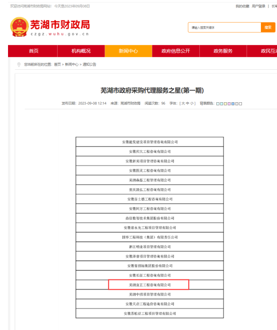 2023年9月8日,芜湖宜正工程咨询有限公司(以下简称“宜正公司”)荣获市财政局第一期“芜湖市政府采购代理服务之星”。