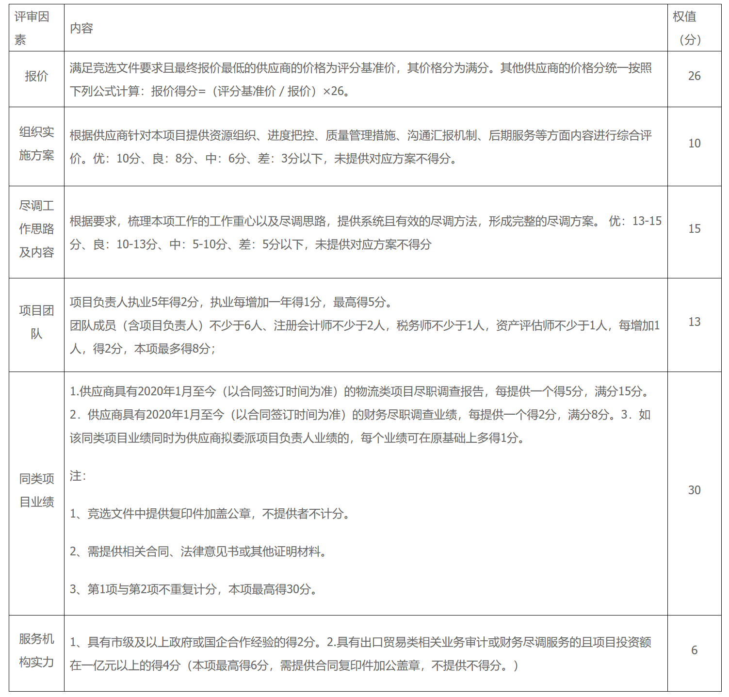 1.项目服务内容:中选单位需按照财务尽职调查相关编制要求完成编制工作并出具财务尽职调查报告,调查目标企业所在行业研究、企业所有者、历史沿革、人力资源、业务情况、经营业绩、财务状况、法律与监管、纳税及债务债务等情况,分析相关运营指标,测算企业未来价值,评估企业财税风险及投资价值。主要包括:(1)调查主营业务及运营原始数据,验证数据真实性、可靠性,揭示数据风险;(2)调查经营业绩、财务状况、税务管理、债务风险、内部控制等情况,提示重大财务、税务及经营管理风险,需验证目标企业财务数据真实性,出具相关财务报表;(3)依据行业现状测算标的公司市场价值,提供估值意见;(4)结合项目情况,提供交易条款建议;(5)结合项目情况,提供有关风险防控措施建议;(6)其他相关事项。2.工期要求及付款方式:签订合同15日内出具财务尽职调查报告初稿,支付合同额的20%,后续根据报告编制要求,待终稿完成后支付尾款。